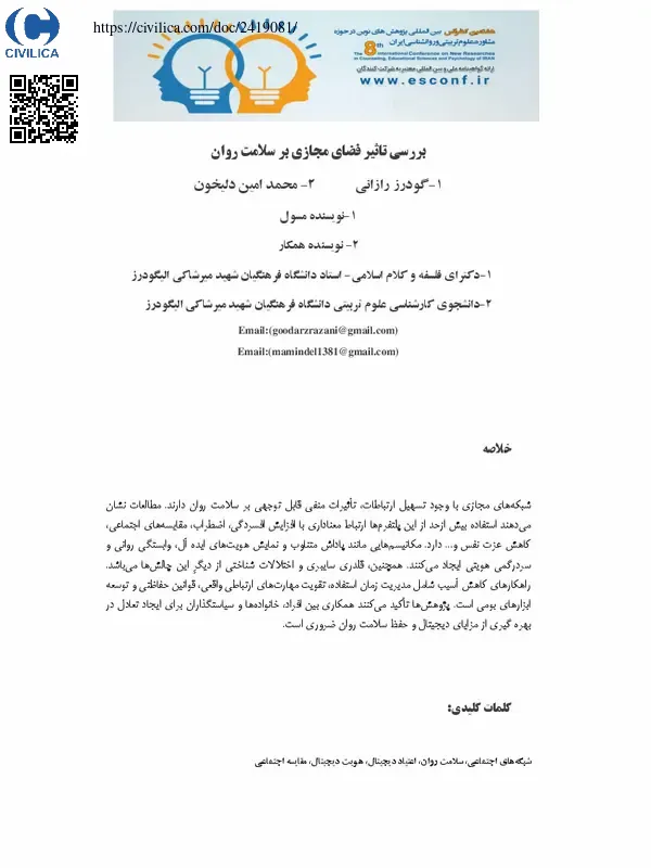 شبکه های مجازی با وجود تسهیل، ارتباطات تاثیرات منفی قابل توجهی بر سلامت روان دارند. مطالعات نشان می دهند استفاده بیش از حد از این پلتفرم ها ارتباط معناداری با افزایش، افسردگی، اضطراب، مقایسه های اجتماعی، کاهش عزت نفس و... دارد. مکانیسم هایی مانند پاداش متناوب و نمایش هویت های ایده آل، وابستگی روانی و سردرگمی هویتی ایجاد می کنند. همچنین قلدری سایبری و اختلالات شناختی از دیگر این چالش ها می باشد. راهکارهای کاهش آسیب شامل مدیریت زمان استفاده، تقویت مهارت های ارتباطی، واقعی، قوانین حفاظتی و توسعه ابزارهای است. پژوهش ها تاکید بومی می کنند همکاری بین افراد، خانواده ها و سیاست گذاران برای ایجاد تعادل در بهره گیری از مزایای دیجیتال و حفظ سلامت روان ضروری است.