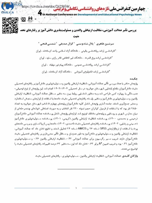 پژوهش حاضر با هدف بررسی تاثیر عدالت آموزشی، شفافیت ارتباطی والدین و مسئولیت پذیری دانش آموز بر رفتارهای تحصیلی مثبت دانش آموزان مقطع ابتدایی شهرستان جوانرود در سال تحصیلی ۱۴۰۴-۱۴۰۳ انجام شد این پژوهش از نوع توصیفی همبستگی با رویکرد کمی طراحی شد و به منظور شناسایی روابط بین سه متغیر مستقل عدالت آموزشی، شفافیت ارتباطی والدین و مسئولیت پذیری دانش آموز و متغیر وابسته رفتارهای تحصیلی، مثبت دادهها با استفاده از ابزارهای سنجش استاندارد و معتبر جمع آوری شدند جامعه آماری پژوهش شامل کلیه دانش آموزان پایههای چهارم تا ششم شهرستان جوانرود به تعداد ۲۸۵۰ نفر بود که با استفاده از فرمول کوکران حجم نمونه ۲۲۰ نفر انتخاب و به صورت تصادفی خوشه ای چندمرحله ای از میان مدارس شهری و روستایی و پایههای مختلف توزیع شد ابزارهای پژوهش شامل پرسشنامه عدالت آموزشی دانش آموزان رحیمی و محمدی، ۱۴۰۰) پرسشنامه شفافیت ارتباطی والدین کریمی، ۱۴۰۱) پرسشنامه مسئولیت پذیری دانش آموز حسینی و رضایی ۱۴۰۲) پرسشنامه رفتارهای تحصیلی مثبت احمدی، ۱۴۰۲) داده ها پس از پاکسازی و بررسی دادههای پرت با استفاده از نرم افزارهای SPSS نسخه ۲۶ و AMOS نسخه ۲۴ تحلیل شدند و نتایج نشان داد که عدالت آموزشی، شفافیت ارتباطی والدین و مسئولیت پذیری دانش آموز به طور همزمان و مستقل تاثیر معنی داری بر رفتارهای تحصیلی مثبت دانش آموزان دارند ضریب مسیر رگرسیون برای عدالت آموزشی ۰.۴۲، شفافیت ارتباطی والدین ۰.۳۶ و مسئولیت پذیری دانش آموز ۰.۳۹ بود و ضریب تعیین R۲ برابر ۶۲ نشان داد که این سه متغیر ۶۲ درصد تغییرات رفتارهای تحصیلی مثبت را توضیح میدهند.