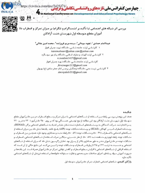 هدف این پژوهش بررسی رابطه بین استفاده از شبکه های اجتماعی با میزان تمرکز و سطح اضطراب در بین دانش آموزان مقطع متوسطه اول شهرستان دشت آزادگان بود. این مطالعه از نوع توصیفی-همبستگی بود که بر روی ۴۵۰ دانش آموز (۲۳۰ دختر و ۲۲۰ پسر) انجام شد. شرکت کنندگان به پرسشنامه های استاندارد شامل مقیاس اعتیاد به شبکه های اجتماعی برگن (BSNAS)، پرسشنامه اضطراب اسپنس کودکان (SCAS) و پرسشنامه مشکلات توجه (API) پاسخ دادند. یافته ها نشان داد بین میزان استفاده از شبکه های اجتماعی با اضطراب (۲۰۴۹) و مشکلات توجه (۲۰۵۲) رابطه مثبت و معناداری وجود دارد. همچنین بین اضطراب و مشکلات توجه رابطه قوی تری مشاهده شد (۵۷) ۲۰ از نظر جنسیتی میانگین نمرات استفاده از شبکه های اجتماعی، اضطراب و مشکلات توجه در دانش آموزان دختر به طور معناداری بالاتر از پسران بود. تحلیل رگرسیون نشان داد که میزان استفاده از شبکه های اجتماعی و جنسیت به ترتیب ۲۲ و ۲۵ از واریانس اضطراب و مشکلات توجه را تبیین می کنند. این نتایج حاکی از آن است که استفاده افراطی از شبکه های اجتماعی با افزایش سطح اضطراب و کاهش توانایی تمرکز در دانش آموزان همراه است. این یافته ها ضرورت آموزش سواد رسانه ای، اجرای مداخلات مدرسه محور و نظارت مسئولانه خانواده ها بر استفاده فرزندان از شبکه های اجتماعی تاکید دارد.