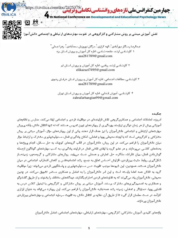 امروزه تعاملات اجتماعی و همکاری گروهی نقش فزاینده ای در موفقیت فردی و اجتماعی ایفا میکند مدارس و نظامهای آموزشی بیش از هر زمان دیگری نیازمند بهره گیری از رویکردهای نوین تدریس هستند که نه تنها انتقال دانش بلکه پرورش مهارتهای ارتباطی و اجتماعی دانش آموزان را نیز هدف قرار دهند یکی از این رویکردهای موثر ،آموزش مبتنی بر روش مشارکتی و کارگروهی است که با ایجاد محیطی پویا و تعاملی امکان یادگیری ،فعال مسئولیت پذیری مشترک و ارتباط موثر میان دانش آموزان را فراهم می کند در این روش دانش آموزان در قالب گروههای کوچک به حل مسائل انجام پروژه ها و بحث های کلاسی می پردازند و هر عضو گروه با ایفای نقشی فعال در فرایند یادگیری به کسب مهارتهای گوناگون از جمله گوش دادن ،فعال بیان ،نظرات ،مذاکره حل تعارض و همدلی دست می یابد روشهای مشارکتی و گروه محور، زمینه ساز شکل گیری روابط مثبت بین فردی افزایش احساس تعلق به جمع رشد اعتماد به نفس و کاهش اضطراب اجتماعی در میان دانش آموزان هستند ،همچنین این شیوهها موجب تقویت حس مسئولیت پذیری و پاسخگویی فردی میشوند؛ زیرا موفقیت گروه به تلاش همه اعضا وابسته است و این امر دانش آموزان را به تعامل و همکاری مستمر تشویق می کند در چنین محیطی دانش آموزان یاد می گیرند که به تفاوتهای فردی احترام بگذارند دیدگاههای مختلف را بشنوند و از طریق گفت وگو و همفکری به تصمیم گیریهای مشترک برسند آموزش مبتنی بر روش مشارکتی و کارگروهی با تبدیل کلاس درس به فضایی پویا حمایتگر و تعاملی زمینه رشد همه جانبه دانش آموزان را فراهم می کند این رویکرد میتواند به عنوان ابزاری کارآمد در دست معلمان قرار گیرد تا از طریق ،آن علاوه بر انتقال ،دانش به تقویت سرمایه اجتماعی و مهارتهای بین فردی . دانش آموزان بپردازند.