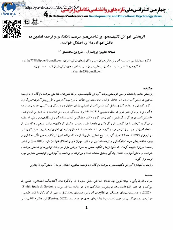 پژوهش حاضر با هدف بررسی اثر بخشی برنامه آموزش تکلیف محور بر شاخصهای شناختی سرعت نام گذاری و ترجمه نمادین در دانش آموزان دارای اختلال خواندن انجام شد. این مطالعه از نوع نیمه آزمایشی با طرح پیش آزمون-پس آزمون و گروه کنترل بود. جامعه آماری شامل کلیه دانش آموزان ابتدایی دارای اختلال ویژه یادگیری با آسیب خواندن در ناحیه ۲ آموزش و پرورش شهر تبریز در سال تحصیلی ۱۴۰۴-۱۴۰۳ بود. نمونه گیری به روش هدفمند و در دسترس انجام شد و ۶۰ دانش آموز در دو گروه آزمایش و کنترل هر گروه ۳۰ نفر) جایگزین شدند برنامه آموزش تکلیف محور طی ۱۱ جلسه برای گروه آزمایش اجرا گردید. ابزار گردآوری داده ها مقیاس هوشی وکسلر کودکان ویرایش پنجم بود که پیش از مداخله آموزشی و پس از آن در هر دو گروه اجرا شد. دادهها با استفاده از روشهای آماری توصیفی و تحلیل کواریانس در نرم افزار SPSS نسخه ۲۶ تحلیل گردید. نتایج تحلیل آماری نشان داد که برنامه آموزش تکلیف محور تاثیر معناداری بر بهبود شاخصهای سرعت نام گذاری و ترجمه نمادین در دانش آموزان دارای اختلال خواندن دارد .(۰.۰۱ = p) بر اساس یافته ها، میتوان نتیجه گرفت که آموزشهای تکلیف محور به عنوان روشی موثر در ارتقاء تواناییهای شناختی مرتبط با خواندن در دانش آموزان با اختلال یادگیری قابل استفاده است و میتواند در برنامه های آموزشی و توانبخشی مدارس مورد توجه قرار گیرد.
