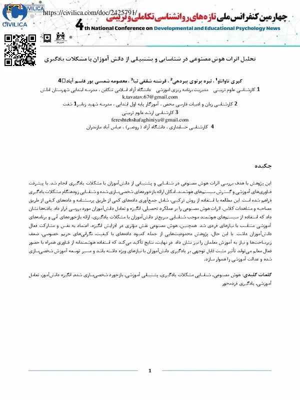 هوش مصنوعی ، شناسایی مشکلات یادگیری ، پشتیبانی آموزشی ، بازخورد شخصی سازی شده ، انگیزه دانش آموز ، تعامل آموزشی ، یادگیری فردمحور