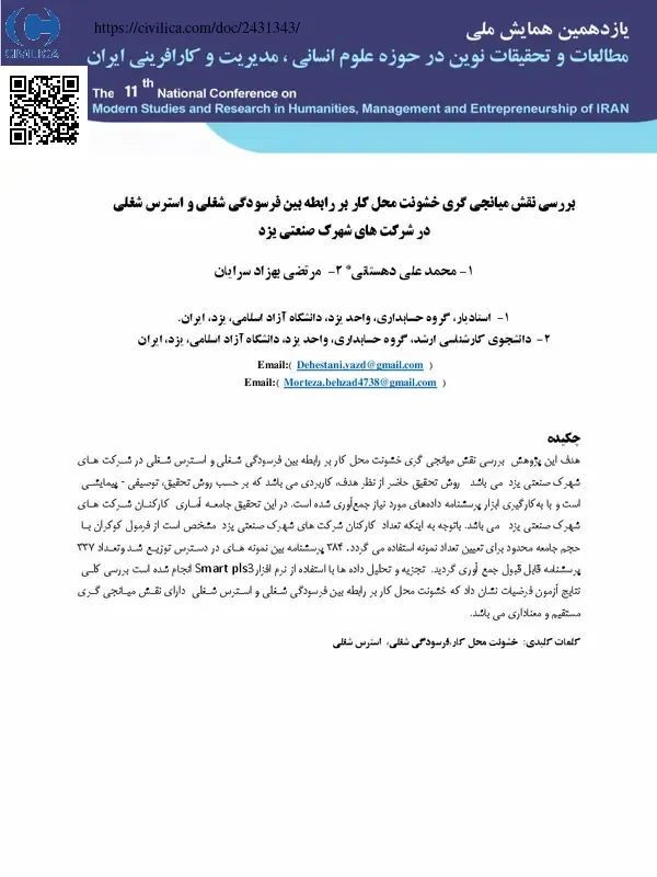 بررسی نقش میانجی گری خشونت محل کار بر رابطه بین فرسودگی شغلی و استرس شغلی در شرکتهای شهرک صنعتی یزد