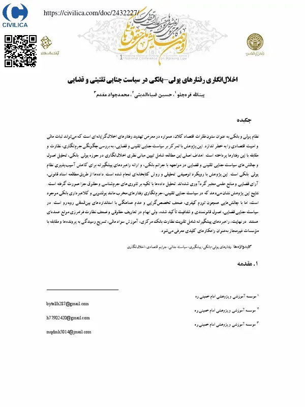 نظام پولی و بانکی به عنوان ستون فقرات اقتصاد کلان همواره در معرض تهدید رفتارهای اخلال گرانه است که می تواند ثبات مالی و امنیت اقتصادی را به خطر اندازد. این پژوهش با تمرکز بر سیاست جنایی تقنینی و قضایی، به بررسی چگونگی جرم انگاری، نظارت و مقابله با این رفتارها پرداخته است. اهداف اصلی این مطالعه شامل تبیین مبانی نظری اخلال انگاری در حوزه پولی-بانکی، تحلیل اصول و چالش های سیاست جنایی تقنینی و قضایی در مواجهه با جرائم بانکی و ارائه راهبردهای پیشگیرانه برای کاهش آسیب پذیری نظام پولی بانکی است. این پژوهش با رویکرد توصیفی-تحلیلی و روش کتابخانه ای انجام شده است. داده ها از طریق مطالعه اسناد قانونی، آرای قضایی و منابع علمی معتبر گردآوری شده اند. تحلیل داده ها با تکیه بر تئوری های جرم شناسی و حقوق جزا صورت گرفته است. نتایج این پژوهش نشان می دهد که در سیاست جنایی تقنینی جرم انگاری رفتارهای مخرب مانند پولشویی و کلاهبرداری بانکی موجود است، اما با چالش هایی همچون تورم کیفری، ضعف تخصص گرایی و عدم هماهنگی با استانداردهای بین المللی روبه رو است. در سیاست جنایی قضایی اصول قانون مندی و شفافیت تاکید شده ولی ابهام در تعاریف حقوقی و ضعف نظارت فرامرزی موانع عمده ای هستند. در نهایت، راهبردهای پیشگیرانه شامل تقویت نظارت بانک مرکزی، آموزش سواد مالی، تسریع رسیدگی به پرونده ها و مقابله با موسسات غیرمجاز به عنوان راهکارهای کلیدی معرفی می شود.