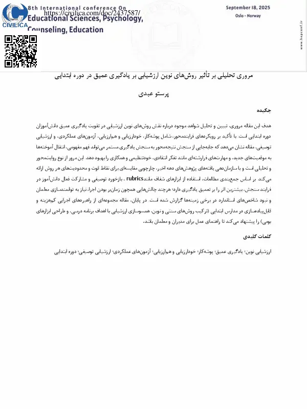 هدف این مقاله مروری، تبیین و تحلیل شواهد موجود درباره نقش روش های نوین ارزشیابی در تقویت یادگیری عمیق دانش آموزان دوره ابتدایی است. با تاکید بر رویکردهای فرایندمحور، شامل پوشه کار، خودارزیابی و هم ارزیابی، آزمون های عملکردی، و ارزشیابی توصیفی، مقاله نشان می دهد که جابه جایی از سنجش نتیجه محور به سنجش یادگیری مستمر می تواند فهم مفهومی، انتقال آموخته ها به موقعیت های جدید، و مهارت های فرارشته ای مانند تفکر انتقادی، خودتنظیمی و همکاری را بهبود دهد. این مرور از نوع روایت محور و تحلیلی است و با سازمان دهی یافته های پژوهش های دهه اخیر، چارچوبی مقایسه ای برای نقاط قوت و محدودیت های هر روش ارائه می کند. بر اساس جمع بندی مطالعات، استفاده از ابزارهای شفاف مانند rubrics، بازخورد توصیفی و مشارکت فعال دانش آموز در فرایند سنجش، بیشترین اثر را بر تعمیق یادگیری دارد؛ هرچند چالش هایی همچون زمان بر بودن اجرا، نیاز به توانمندسازی معلمان و نبود شاخص های استاندارد در برخی زمینه ها گزارش شده است. در پایان، مقاله مجموعه ای از راهبردهای اجرایی کم هزینه و قابل پیاده سازی در مدارس ابتدایی (ترکیب روش های سنتی و نوین، همسوسازی ارزشیابی با اهداف برنامه درسی، و طراحی ابزارهای بومی) را پیشنهاد می کند تا راهنمای عمل برای مدیران و معلمان باشد.