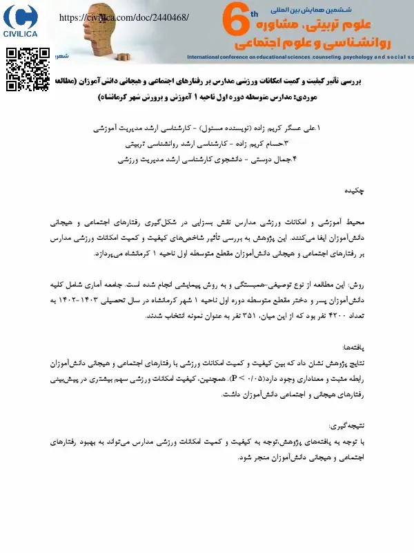بررسی تاثیر کیفیت و کمیت امکانات ورزشی مدارس بر رفتارهای اجتماعی و هیجانی دانش آموزان (مطالعه موردی: مدارس متوسطه دوره اول ناحیه ۱ آموزش و پرورش شهر کرمانشاه)