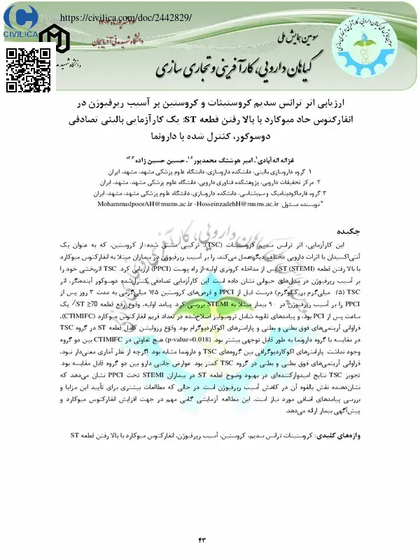 ارزیابی اثر ترانس سدیم کروستینات و کروستین بر آسیب رپرفیوژن در انفارکتوس حاد میوکارد با بالا رفتن قطعه:ST یک کارآزمایی بالینی تصادفی دوسوکور، کنترل شده با دارونما