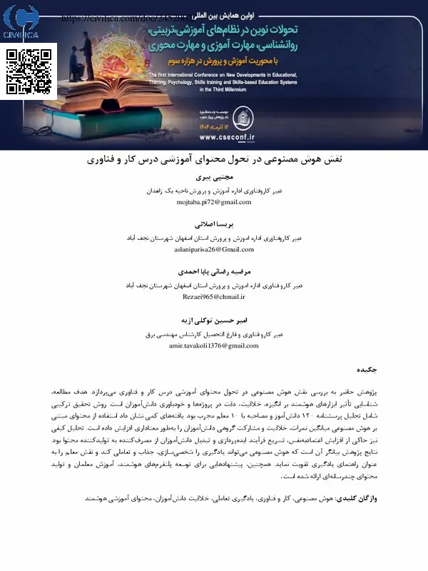 پژوهش حاضر به بررسی نقش هوش مصنوعی در تحول محتوای آموزشی درس کار و فناوری می پردازد. هدف مطالعه، شناسایی تاثیر ابزارهای هوشمند بر انگیزه، خلاقیت، دقت در پروژه ها و خودباوری دانش آموزان است. روش تحقیق ترکیبی شامل تحلیل پرسشنامه ۱۲۰ دانش آموز و مصاحبه با ۱۰ معلم مجرب بود. یافته های کمی نشان داد استفاده از محتوای مبتنی بر هوش مصنوعی میانگین نمرات، خلاقیت و مشارکت گروهی دانش آموزان را به طور معناداری افزایش داده است. تحلیل کیفی نیز حاکی از افزایش اعتمادبه نفس، تسریع فرآیند ایده پردازی و تبدیل دانش آموزان از مصرف کننده به تولیدکننده محتوا بود. نتایج پژوهش بیانگر آن است که هوش مصنوعی می تواند یادگیری را شخصی سازی، جذاب و تعاملی کند و نقش معلم را به عنوان راهنمای یادگیری تقویت نماید. همچنین، پیشنهادهایی برای توسعه پلتفرم های هوشمند، آموزش معلمان و تولید محتوای چندرسانه ای ارائه شده است.