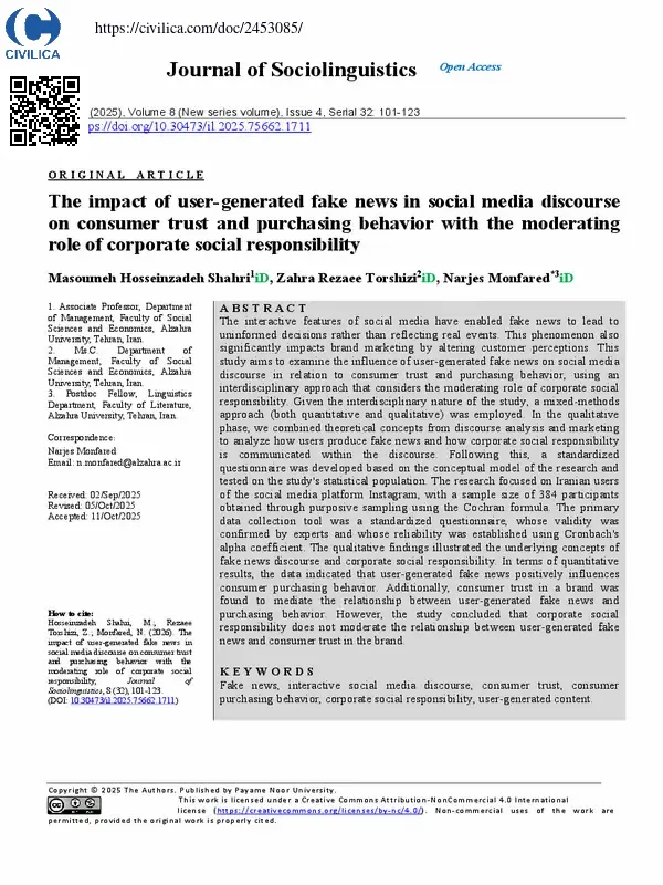 تاثیر اخبار جعلی تولیدشده توسط کاربر در گفتمان رسانه اجتماعی بر اعتماد و رفتار خرید مصرف کننده با نقش تعدیل گری مسئولیت اجتماعی شرکت