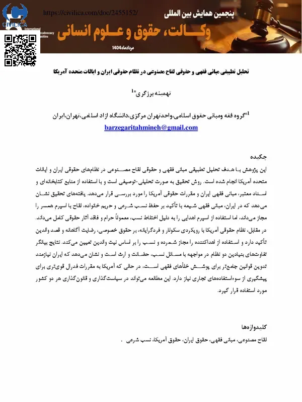 تحلیل تطبیقی مبانی فقهی و حقوقی لقاح مصنوعی در نظام حقوقی ایران و ایالات متحده آمریکا