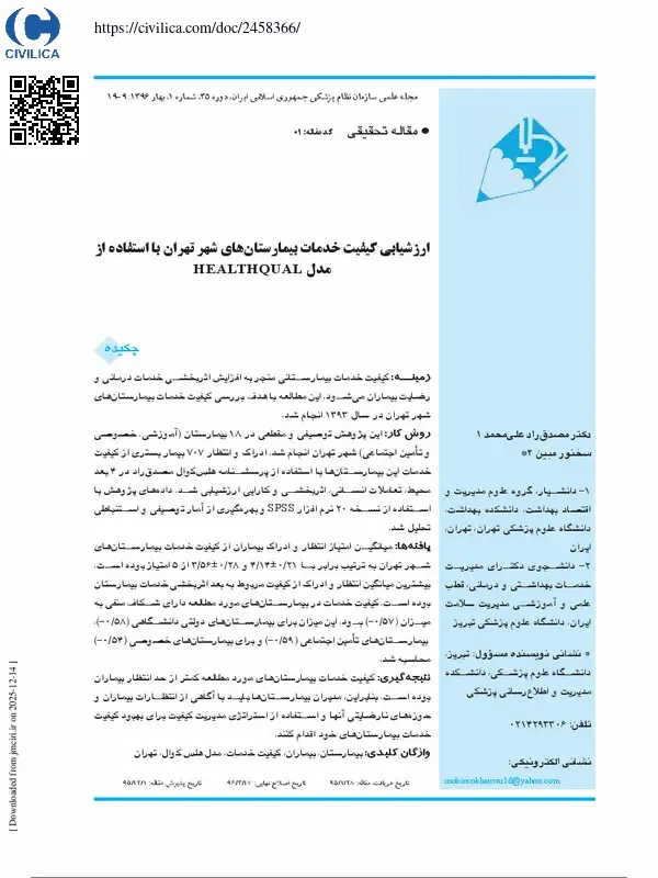 Hospital ، Patients ، Services quality ، Healthqual model ، Tehran ، بیمارستان ، بیماران ، کیفیت خدمات ، مدل هلس کوال ، تهران
