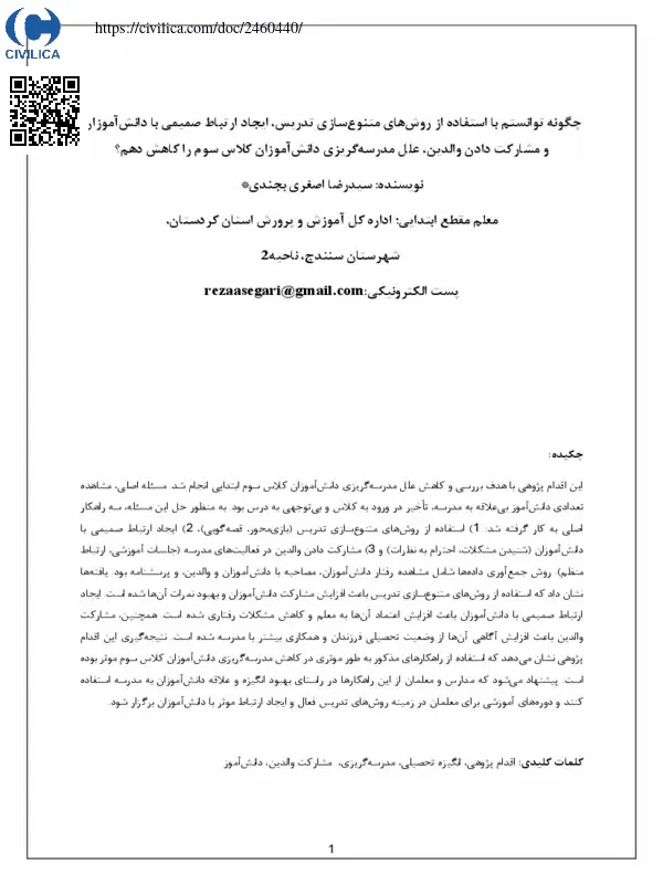 این اقدام پژوهی با هدف بررسی و کاهش علل مدرسه گریزی دانش آموزان کلاس سوم ابتدایی انجام شد. مسئله اصلی، مشاهده تعدادی دانش آموز بی علاقه به مدرسه، تاخیر در ورود به کلاس و بی توجهی به درس بود. به منظور حل این مسئله، سه راهکار اصلی به کار گرفته شد: ۱) استفاده از روش های متنوع سازی تدریس (بازی محور، قصه گویی)، ۲) ایجاد ارتباط صمیمی با دانش آموزان (شنیدن مشکلات، احترام به نظرات) و ۳) مشارکت دادن والدین در فعالیت های مدرسه (جلسات آموزشی، ارتباط منظم). روش جمع آوری داده ها شامل مشاهده رفتار دانش آموزان، مصاحبه با دانش آموزان و والدین، و پرسشنامه بود. یافته ها نشان داد که استفاده از روش های متنوع سازی تدریس باعث افزایش مشارکت دانش آموزان و بهبود نمرات آن ها شده است. ایجاد ارتباط صمیمی با دانش آموزان باعث افزایش اعتماد آن ها به معلم و کاهش مشکلات رفتاری شده است. همچنین، مشارکت والدین باعث افزایش آگاهی آن ها از وضعیت تحصیلی فرزندان و همکاری بیشتر با مدرسه شده است. نتیجه گیری این اقدام پژوهی نشان می دهد که استفاده از راهکارهای مذکور به طور موثری در کاهش مدرسه گریزی دانش آموزان کلاس سوم موثر بوده است. پیشنهاد می شود که مدارس و معلمان از این راهکارها در راستای بهبود انگیزه و علاقه دانش آموزان به مدرسه استفاده کنند و دوره های آموزشی برای معلمان در زمینه روش های تدریس فعال و ایجاد ارتباط موثر با دانش آموزان برگزار شود