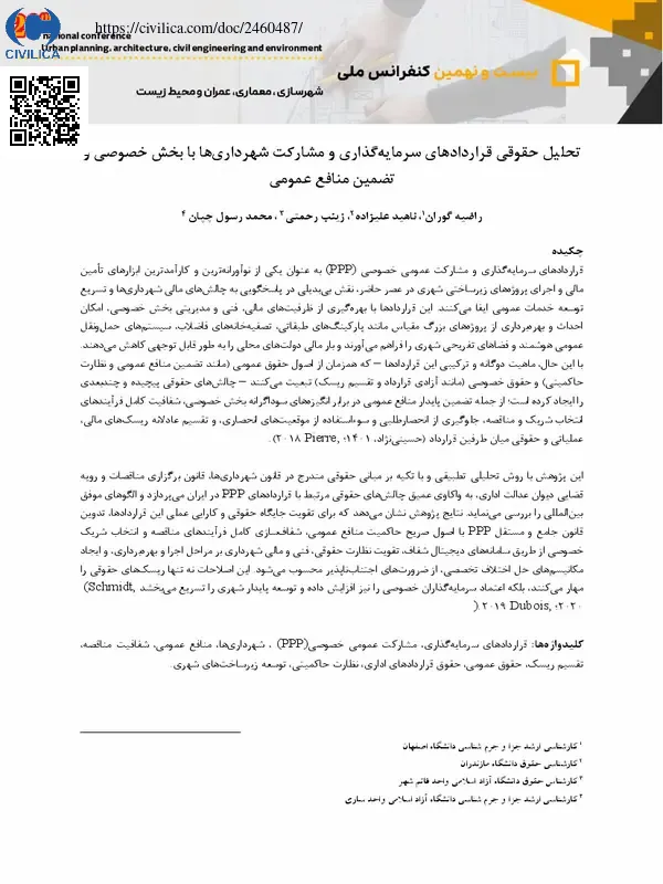قراردادهای سرمایه گذاری و مشارکت عمومی-خصوصی (PPP) به عنوان یکی از نوآورانه ترین و کارآمدترین ابزارهای تامین مالی و اجرای پروژه های زیرساختی شهری در عصر حاضر، نقش بی بدیلی در پاسخگویی به چالش های مالی شهرداری ها و تسریع توسعه خدمات عمومی ایفا می کنند. این قراردادها با بهره گیری از ظرفیت های مالی، فنی و مدیریتی بخش خصوصی، امکان احداث و بهره برداری از پروژه های بزرگ مقیاس مانند پارکینگ های طبقاتی، تصفیه خانه های فاضلاب، سیستم های حمل ونقل عمومی هوشمند و فضاهای تفریحی شهری را فراهم می آورند و بار مالی دولت های محلی را به طور قابل توجهی کاهش می دهند. با این حال، ماهیت دوگانه و ترکیبی این قراردادها – که همزمان از اصول حقوق عمومی (مانند تضمین منافع عمومی و نظارت حاکمیتی) و حقوق خصوصی (مانند آزادی قرارداد و تقسیم ریسک) تبعیت می کنند – چالش های حقوقی پیچیده و چندبعدی را ایجاد کرده است؛ از جمله تضمین پایدار منافع عمومی در برابر انگیزه های سوداگرانه بخش خصوصی، شفافیت کامل فرآیندهای انتخاب شریک و مناقصه، جلوگیری از انحصارطلبی و سوءاستفاده از موقعیت های انحصاری، و تقسیم عادلانه ریسک های مالی، عملیاتی و حقوقی میان طرفین قرارداد (حسینی نژاد، ۱۴۰۱؛ Pierre, ۲۰۱۸).این پژوهش با روش تحلیلی-تطبیقی و با تکیه بر مبانی حقوقی مندرج در قانون شهرداری ها، قانون برگزاری مناقصات و رویه قضایی دیوان عدالت اداری، به واکاوی عمیق چالش های حقوقی مرتبط با قراردادهای PPP در ایران می پردازد و الگوهای موفق بین المللی را بررسی می نماید. نتایج پژوهش نشان می دهد که برای تقویت جایگاه حقوقی و کارایی عملی این قراردادها، تدوین قانون جامع و مستقل PPP با اصول صریح حاکمیت منافع عمومی، شفاف سازی کامل فرآیندهای مناقصه و انتخاب شریک خصوصی از طریق سامانه های دیجیتال شفاف، تقویت نظارت حقوقی، فنی و مالی شهرداری بر مراحل اجرا و بهره برداری، و ایجاد مکانیسم های حل اختلاف تخصصی، از ضرورت های اجتناب ناپذیر محسوب می شود. این اصلاحات نه تنها ریسک های حقوقی را مهار می کنند، بلکه اعتماد سرمایه گذاران خصوصی را نیز افزایش داده و توسعه پایدار شهری را تسریع می بخشد (Schmidt, ۲۰۲۰؛ Dubois, ۲۰۱۹).