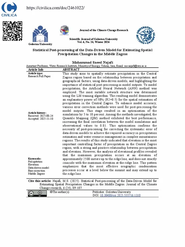 این مطالعه با هدف برآورد مکانی بارش در منطقه زاگرس میانی بر اساس روابط بین بارش و عوامل جغرافیایی، استفاده از مدل های داده محور و همچنین اهمیت پس پردازش آماری در برونداد مدل ها انجام شده است. برای مدل سازی بارش از روش شبکه های عصبی مصنوعی استفاده شد. مناسب ترین ساختار شبکه (آرایش دو لایه پنهان ۱-۸-۸) با قانون آموزش مارکوات-لونبرگ تعیین شد و میزان تبیین واریانس بارش توسط مدل ارائه شده برای برآورد مکانی بارش در زاگرس میانی ۵۰ درصد (R۲=۰.۵) است. به منظور افزایش دقت مدل، از روش های مختلف تصحیح خطا جهت پس پردازش خروجی های مدل استفاده شد. این مرحله باعث بهینه سازی شبیه سازی ها به میزان ۵ تا ۱۰ درصد شد. در این میان، روش نگاشت چندک (QM) با ارتقاء همبستگی نهایی شبیه سازی های مدل با مقادیر مشاهداتی از ۷۱/۰ به ۸۱/۰، بهترین عملکرد را در بین روش های مورد بررسی داشت. این بهینه سازی، ضرورت پس پردازش را در تصحیح خطای سیستماتیک مدل های داده محور برای رسیدن به دقت مورد نیاز در تخمین بارش و مدیریت منابع آب در مناطق کوهستانی پیچیده را تایید می کند. نتایج این مطالعه نشان داد که ارتفاع، مهم ترین عامل کنترل کننده بارش در منطقه زاگرس میانی است و یک رابطه قوی و مثبت بین بارش و ارتفاع وجود دارد. با این حال، تحلیل نیمرخ های ارتفاعی آشکار کرد که حداکثر بارش در ارتفاعی حدود ۲۵۰۰ متر تا خط الراس رخ می دهد و عینا منطبق با حداکثر ارتفاع در خط الراس نیست؛ این امر فرضیه تکمیل فرآیند تخلیه رطوبت توده های هوا قبل از رسیدن به خط الراس اصلی را تایید می کند.