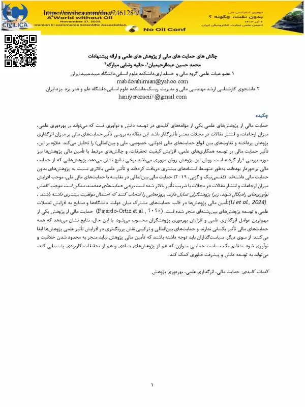 حمایت مالی از پژوهش های علمی یکی از مولفه های کلیدی در توسعه دانش و نوآوری است که می تواند بر بهره وری علمی، میزان ارجاعات، و انتشار مقالات در مجلات معتبر تاثیرگذار باشد. این مقاله به بررسی تاثیر حمایت های مالی بر میزان اثرگذاری پژوهش پرداخته و تفاوت های بین انواع حمایت های مالی (دولتی، خصوصی، ملی و بین المللی) را تحلیل می کند. علاوه بر این، تاثیر حمایت مالی بر توسعه همکاری های علمی، افزایش کیفیت تحقیقات، و چالش های مرتبط با تامین مالی پژوهش ها نیز مورد بررسی قرار گرفته است. روش این پژوهش روش مروری می باشد برخی نتایج نشان می دهد پژوهش هایی که از حمایت مالی برخوردار بوده اند، به طور متوسط استنادهای بیشتری دریافت کرده اند و تاثیر علمی بالاتری نسبت به پژوهش های بدون حمایت مالی داشته اند. (قاسمی نیک و گزنی، ۲۰۱۹) حمایت مالی بین المللی در مقایسه با حمایت های مالی ملی، موجب افزایش میزان ارجاعات و انتشار مقالات در مجلات با ضریب تاثیر بالاتر شده است برخی حمایت های هدفمند ممکن است موجب کاهش نوآوری های رادیکال شوند، زیرا پژوهشگران تمایل دارند پروژه هایی را انتخاب کنند که احتمال موفقیت بیشتری داشته باشند. (Li et al., ۲۰۲۴) تامین مالی پژوهش ها در قالب حمایت های مشترک میان دولت، دانشگاه ها و صنایع به افزایش تعاملات علمی و توسعه پژوهش های بین رشته ای منجر شده است (Fajardo-Ortiz et al., ۲۰۲۴). حمایت مالی از پژوهش یکی از مهم ترین عوامل اثرگذاری علمی و افزایش بهره وری پژوهشگران محسوب می شود. با این حال، نتایج نشان می دهد که همه حمایت های مالی تاثیر یکسانی ندارند و حمایت های بین المللی و ترکیبی نقش پررنگ تری در افزایش تاثیر علمی پژوهش ها ایفا می کنند. از سوی دیگر، سیاست گذاران باید توجه داشته باشند که تامین مالی پژوهش نباید منجر به محدود شدن خلاقیت و نوآوری شود. تنظیم یک سیاست حمایتی متوازن که هم از پژوهش های بنیادی و هم از تحقیقات کاربردی پشتیبانی کند، می تواند به توسعه دانش و پیشرفت فناوری کمک کند.