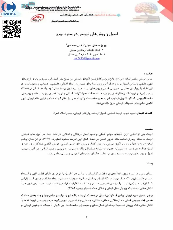 سیره تربیتی پیامبر اسلام (ص) از جامع ترین و کامل ترین الگوهای تربیتی در تاریخ بشر است. این سیره بر پایه ی ارزش های الهی، عقلانی و انسانی استوار بوده و هدف آن پرورش انسان های متعادل در ابعاد اخلاقی، عقیدتی، اجتماعی و معنوی است. در این مقاله با رویکردی تحلیلی به بررسی اصول و روش های تربیت در سیره نبوی پرداخته می شود. یافته ها نشان می دهد که پیامبر (ص) در تربیت انسان ها از اصولی چون محبت، عدالت، مدارا، کرامت انسانی و تربیت تدریجی بهره برده اند و روش هایی مانند الگو بودن، گفتگو، تشویق، تهذیب، امر به معروف، نصیحت و تربیت عملی را به کار گرفته است. بنابراین نظام تربیتی نبوی الگویی جامع برای نظام های تربیتی امروز ارائه می دهد.