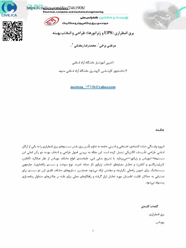 امروزه وابستگی حیات اقتصادی، اجتماعی و امنیتی جامعه به تداوم تامین برق، نقش سیستم های برق اضطراری را به یکی از ارکان اساسی طراحی تاسیسات الکتریکی تبدیل کرده است. این مقاله به بررسی اصول طراحی و انتخاب بهینه دو رکن اصلی این سیستم ها—یوپیاس و ژنراتور—می پردازد. با تشریح مبانی فنی، طبقه بندی انواع مختلف یوپیاس از نظر عملکرد (آفلاین، لاین اینتراکتیو و آنلاین) و تحلیل معیارهای انتخاب ژنراتور (از جمله قدرت، نوع سوخت و سیستم راه اندازی)، چارچوبی سیستماتیک برای تدوین راه حلی یکپارچه و مطمئن ارائه می شود. همچنین، سناریوهای مختلف تلفیق این دو سیستم برای دستیابی به حداکثر قابلیت اطمینان مورد تحلیل قرار گرفته و راهکارهای عملی برای غلبه بر چالش های متداول پیاده سازی پیشنهاد می شود.