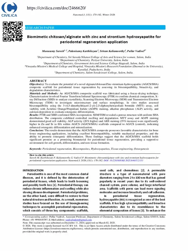 Objective(s): To evaluate the potential of a novel alginate/chitosan/Zinc-strontium hydroxyapatite (AG/CS/SHA) composite scaffold for periodontal tissue regeneration by assessing its biocompatibility, bioactivity, and degradation characteristics.Materials and Methods: An AG/CS/SHA composite scaffold was fabricated using a freeze-drying technique. Characterization involved Fourier Transform Infrared Spectroscopy (FTIR) to confirm chemical composition, X-ray Diffraction (XRD) to analyze crystallinity, Scanning Electron Microscopy (SEM) and Transmission Electron Microscopy (TEM) to investigate microstructure and surface morphology. In vitro studies assessed biocompatibility using the ۳-(۴,۵-dimethylthiazol-۲-yl)-۲,۵-diphenyltetrazolium bromide (MTT) assay, cell viability with Acridine Orange/Propidium Iodide (AO/PI) staining, alkaline phosphatase (ALP) activity, and calcium deposition to evaluate osteogenic differentiation.Results: FTIR and XRD confirmed SHA incorporation. SEM/TEM revealed a porous structure with uniform SHA distribution. The composite exhibited controlled swelling and degradation. MTT assay and AO/PI staining demonstrated good cell viability. ALP activity (۲۰% higher) and ARS staining (۳۵% increase) were significantly higher in Zn and Sr in HA within AG/CS (AG/CS/SHA) scaffolds compared to AG/CS (control), indicating enhanced osteogenic differentiation and mineralization.Conclusion: The results demonstrate that the AG/CS/SHA composite possesses favorable characteristics for bone tissue engineering applications, including excellent biocompatibility, suitable mechanical properties, and the ability to promote osteogenic differentiation. These findings suggest that the AG/CS/SHA scaffold holds significant promise as a promising biomaterial for periodontal tissue regeneration, providing a supportive environment for cell growth, differentiation, and new tissue formation.