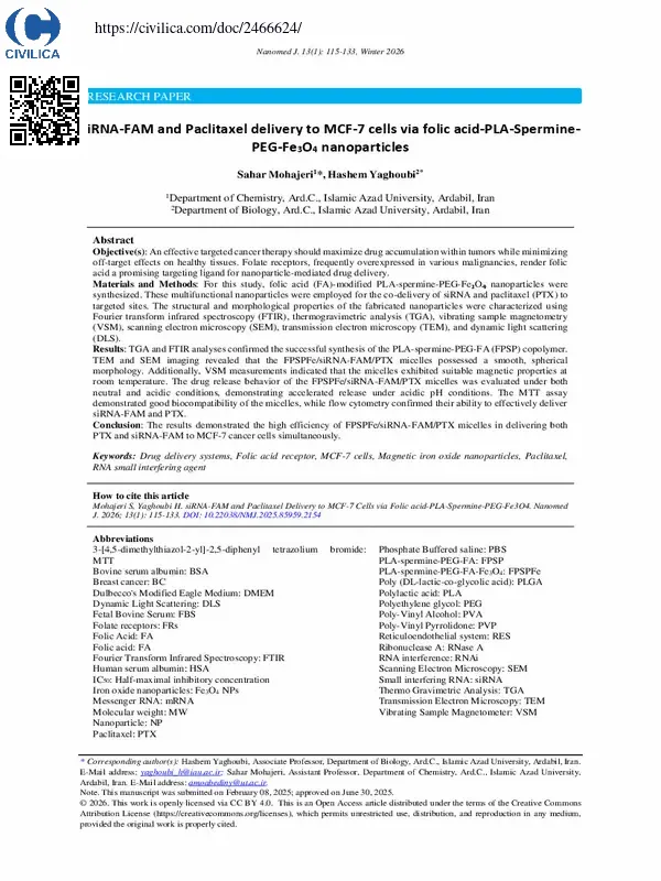 Objective(s): An effective targeted cancer therapy should maximize drug accumulation within tumors while minimizing off-target effects on healthy tissues. Folate receptors, frequently overexpressed in various malignancies, render folic acid a promising targeting ligand for nanoparticle-mediated drug delivery.Materials and Methods: For this study, folic acid (FA)-modified PLA-spermine-PEG-Fe₃O₄ nanoparticles were synthesized. These multifunctional nanoparticles were employed for the co-delivery of siRNA and paclitaxel (PTX) to targeted sites. The structural and morphological properties of the fabricated nanoparticles were characterized using Fourier transform infrared spectroscopy (FTIR), thermogravimetric analysis (TGA), vibrating sample magnetometry (VSM), scanning electron microscopy (SEM), transmission electron microscopy (TEM), and dynamic light scattering (DLS).Results: TGA and FTIR analyses confirmed the successful synthesis of the PLA-spermine-PEG-FA (FPSP) copolymer. TEM and SEM imaging revealed that the FPSPFe/siRNA-FAM/PTX micelles possessed a smooth, spherical morphology. Additionally, VSM measurements indicated that the micelles exhibited suitable magnetic properties at room temperature. The drug release behavior of the FPSPFe/siRNA-FAM/PTX micelles was evaluated under both neutral and acidic conditions, demonstrating accelerated release under acidic pH conditions. The MTT assay demonstrated good biocompatibility of the micelles, while flow cytometry confirmed their ability to effectively deliver siRNA-FAM and PTX.Conclusion: The results demonstrated the high efficiency of FPSPFe/siRNA-FAM/PTX micelles in delivering both PTX and siRNA-FAM to MCF-۷ cancer cells simultaneously.