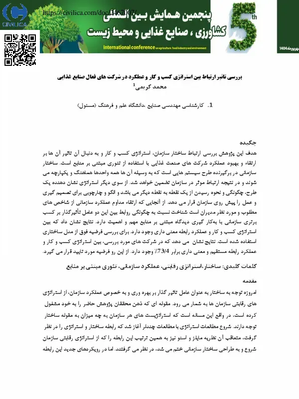 هدف این پژوهش بررسی ارتباط ساختار سازمان، استراتژی کسب و کار و به دنبال آن تاثیر آن ها بر ارتقاء و بهبود عملکرد شرکت های صنعت غذایی با استفاده از تئوری مبتنی بر منابع است. ساختار سازمانی در برگیرنده طرح سیستم هایی است که به وسیله آن ها همه واحدها هماهنگ و یکپارچه می شوند و در نتیجه ارتباط موثر در سازمان تضمین خواهد شد. از سوی دیگر استراتژی نشان دهنده یک طرح، چگونگی و نحوه رسیدن از یک نقطه به نقطه دیگر می باشد و الگو و چارچوبی برای تصمیم گیری و عمل را پیش روی سازمان قرار می دهد. از آنجایی که ارتقاء مداوم عملکرد سازمانی از شاخص های مطلوب و مورد نظر مدیران است شناخت نسبت به چگونگی روابط بین این دو عامل تاثیرگذار بر کسب برتری سازمانی با بهکار گیری دیدگاه مبتنی بر منابع مهم و اهمیت دارد. نتایج نشان داد که بین استراتژی کسب و کار و عملکرد رابطه معنی داری وجود دارد. برای بررسی فرضیه فوق از مدل ساختاری استفاده شده است. نتایج نشان می دهد که در شرکت های مورد بررسی، بین استراتژی کسب و کار و عملکرد رابطه مستقیم و معنی داری برابر ۴/۷۳% وجود دارد. از این رو فرضیه مورد تایید قرار می گیرد.