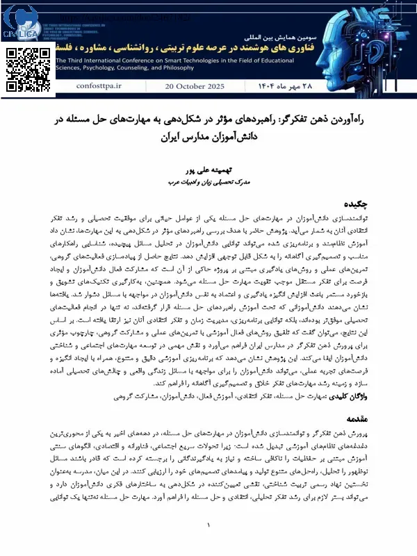 توانمندسازی دانش آموزان در مهارت های حل مسئله یکی از عوامل حیاتی برای موفقیت تحصیلی و رشد تفکر انتقادی آنان به شمار می آید. پژوهش حاضر با هدف بررسی راهبردهای موثر در شکل دهی به این مهارت ها، نشان داد آموزش نظام مند و برنامه ریزی شده می تواند توانایی دانش آموزان در تحلیل مسائل پیچیده، شناسایی راهکارهای مناسب و تصمیم گیری آگاهانه را به شکل قابل توجهی افزایش دهد. نتایج حاصل از پیاده سازی فعالیت های گروهی، تمرین های عملی و روش های یادگیری مبتنی بر پروژه حاکی از آن است که مشارکت فعال دانش آموزان و ایجاد فرصت برای تفکر مستقل موجب تقویت مهارت حل مسئله می شود. همچنین، به کارگیری تکنیک های تشویق و بازخورد مستمر باعث افزایش انگیزه یادگیری و اعتماد به نفس دانش آموزان در مواجهه با مسائل دشوار شد. یافته ها نشان می دهند دانش آموزانی که تحت آموزش راهبردهای حل مسئله قرار گرفته اند، نه تنها در انجام فعالیت های تحصیلی موفق تر بوده اند، بلکه توانایی برنامه ریزی، مدیریت زمان و تفکر انتقادی آنان نیز ارتقا یافته است. بر اساس این نتایج، می توان گفت که تلفیق روش های فعال آموزشی با تمرین های عملی و مشارکت گروهی، چارچوب موثری برای پرورش ذهن تفکرگر در مدارس ایران فراهم می آورد و نقش مهمی در توسعه مهارت های اجتماعی و شناختی دانش آموزان ایفا می کند. این پژوهش نشان می دهد که برنامه ریزی آموزشی دقیق و متنوع، همراه با ایجاد انگیزه و فرصت های تجربه عملی، می تواند دانش آموزان را برای مواجهه با مسائل زندگی واقعی و چالش های تحصیلی آماده سازد و زمینه رشد مهارت های تفکر خلاق و تصمیم گیری آگاهانه را فراهم کند.