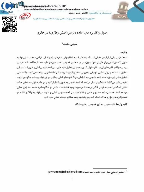 اعاده دادرسی یکی از ابزارهای حقوقی است که به منظور اصلاح احکام نهایی صادره از مراجع قضایی طراحی شده است. این نهاد به عنوان یک حق قانونی برای طرفین دعوا، به ویژه در زمینه حقوق خصوصی، اهمیت ویژه ای دارد. هدف از مطالعه اعاده دادرسی، بررسی جایگاه و کاربردهای آن در نظام حقوقی کشور و همچنین تحلیل تفاوت های میان اعاده دادرسی اصلی و طاری است. در این تحقیق، با استفاده از روش تحلیلی-توصیفی، به بررسی مفاهیم پایه ای، شرایط و آثار اعاده دادرسی پرداخته می شود. سوالات اصلی تحقیق شامل این موارد است: اعاده دادرسی چه شرایطی دارد؟ تفاوت های اصلی و طاری در این نهاد چیست و چگونه بر فرآیند دادرسی تاثیر می گذارد؟ نتیجه گیری نشان می دهد که اعاده دادرسی به عنوان یک ابزار کلیدی در نظام حقوقی، به تحقق عدالت قضایی کمک می کند و به طرفین امکان می دهد تا در صورت وجود اشتباهات یا نواقص در احکام صادره، مجددا به مراجع قضایی مراجعه کنند. همچنین، فهم صحیح و جامع از تفاوت های بین اعاده دادرسی اصلی و طاری، می تواند به وکلا و قضات در تصمیم گیری های موثر و عادلانه کمک کند و در نهایت به بهبود عملکرد سیستم قضایی منجر شود.