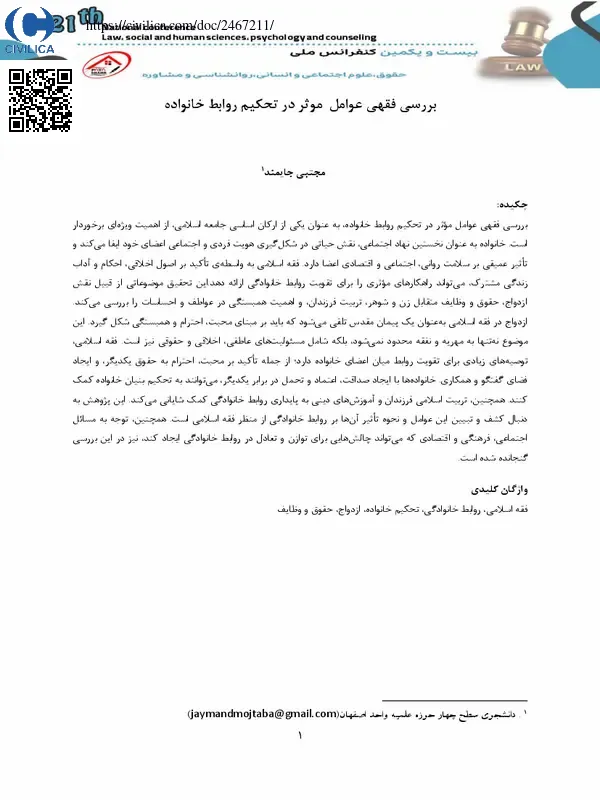 بررسی فقهی عوامل موثر در تحکیم روابط خانواده، به عنوان یکی از ارکان اساسی جامعه اسلامی، از اهمیت ویژه ای برخوردار است. خانواده به عنوان نخستین نهاد اجتماعی، نقش حیاتی در شکل گیری هویت فردی و اجتماعی اعضای خود ایفا می کند و تاثیر عمیقی بر سلامت روانی، اجتماعی و اقتصادی اعضا دارد. فقه اسلامی به واسطه ی تاکید بر اصول اخلاقی، احکام و آداب زندگی مشترک، می تواند راهکارهای موثری را برای تقویت روابط خانوادگی ارائه دهد.این تحقیق موضوعاتی از قبیل نقش ازدواج، حقوق و وظایف متقابل زن و شوهر، تربیت فرزندان، و اهمیت همبستگی در عواطف و احساسات را بررسی می کند. ازدواج در فقه اسلامی به عنوان یک پیمان مقدس تلقی می شود که باید بر مبنای محبت، احترام و همبستگی شکل گیرد. این موضوع نه تنها به مهریه و نفقه محدود نمی شود، بلکه شامل مسئولیت های عاطفی، اخلاقی و حقوقی نیز است. فقه اسلامی، توصیه های زیادی برای تقویت روابط میان اعضای خانواده دارد؛ از جمله تاکید بر محبت، احترام به حقوق یکدیگر، و ایجاد فضای گفتگو و همکاری. خانواده ها با ایجاد صداقت، اعتماد و تحمل در برابر یکدیگر، می توانند به تحکیم بنیان خانواده کمک کنند. همچنین، تربیت اسلامی فرزندان و آموزش های دینی به پایداری روابط خانوادگی کمک شایانی می کند. این پژوهش به دنبال کشف و تبیین این عوامل و نحوه تاثیر آن ها بر روابط خانوادگی از منظر فقه اسلامی است. همچنین، توجه به مسائل اجتماعی، فرهنگی و اقتصادی که می تواند چالش هایی برای توازن و تعادل در روابط خانوادگی ایجاد کند، نیز در این بررسی گنجانده شده است.