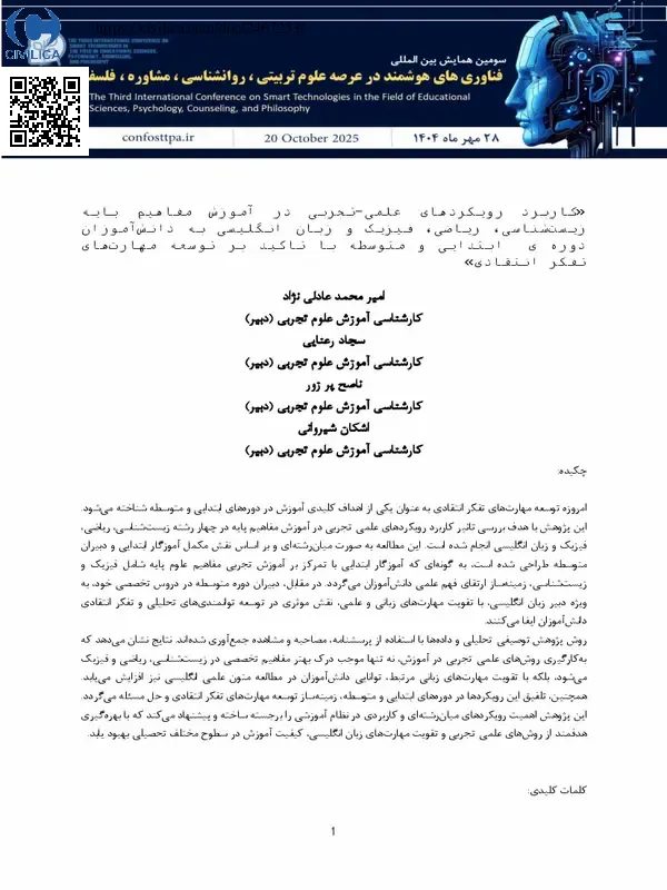 «کاربرد رویکردهای علمی-تجربی در آموزش مفاهیم پایه زیست شناسی، ریاضی، فیزیک و زبان انگلیسی به دانش آموزان دوره ی ابتدایی و متوسطه با تاکید بر توسعه مهارت های تفکر انتقادی»