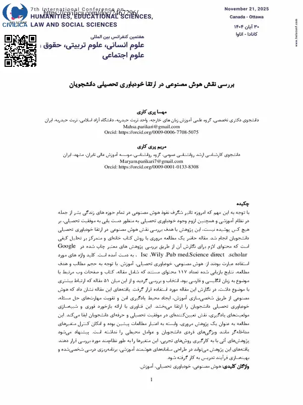 با توجه به این مهم که امروزه تاثیر شگرف نفوذ هوش مصنوعی در تمام حوزه های زندگی بشر از جمله در نظام آموزشی و همچنین لزوم وجود خودباوری تحصیلی به منظور دست یابی به موفقیت تحصیلی، بر هیچ کس پوشیده نیست، این پژوهش با هدف بررسی نقش هوش مصنوعی در ارتقا خودباوری تحصیلی دانشجویان انجام شد. مقاله حاضر یک مطالعه مروری با روش کتابخانه ای و متمرکز بر تحلیل کیفی است که محتوای لازم برای نگارش آن از طریق بررسی پژوهش های معتبر چاپ شده در Google scholar، Science direct، Pub med، Wily، Isc، به دست آمده است. کلید واژه های مورد استفاده عبارت بودند از: هوش مصنوعی، خودباوری تحصیلی، آموزش. با توجه به حجم مطالب و هدف مطالعه، نتایج بازیابی شده تعداد ۱۱۷ محتوای مستند که شامل مقاله، کتاب و صفحات وب مرتبط با موضوع به زبان انگلیسی و فارسی بود، انتخاب و بررسی گردید و از این میان ۵۱ مقاله که ارتباط بیشتری با موضوع داشت، در نگارش این مقاله مورد استفاده قرار گرفت. یافته های این مقاله نشان داد که هوش مصنوعی از طریق شخصی سازی آموزش، ایجاد محیط یادگیری امن و تقویت مهارت های حل مسئله، خودباوری تحصیلی دانشجویان را ارتقا می بخشد. این فناوری با ارائه بازخورد فوری و شبیه سازی موقعیت های یادگیری، نقش تعیین کننده ای در موفقیت تحصیلی و حرفه ای دانشجویان ایفا می کند. این مطالعه به عنوان یک پژوهش مروری، وابسته به اعتبار مطالعات پیشین بوده و امکان کنترل متغیرهای مداخله گر مانند ویژگی های فردی دانشجویان و عوامل محیطی را نداشته است. پیشنهاد می شود پژوهش های آتی با به کارگیری روش های تجربی، این متغیرها را به طور نظام مند مورد بررسی قرار دهند. یافته های این پژوهش می تواند در طراحی سامانه های هوشمند آموزشی، برنامه ریزی درسی شخصی شده و بهینه سازی فرآیند تدریس به کار گرفته شود.