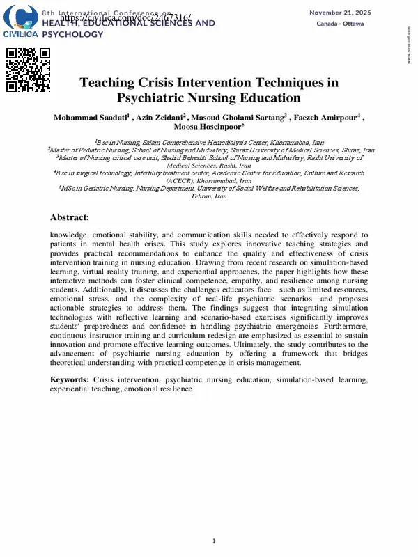 Knowledge, emotional stability, and communication skills needed to effectively respond to patients in mental health crises. This study explores innovative teaching strategies and provides practical recommendations to enhance the quality and effectiveness of crisis intervention training in nursing education. Drawing from recent research on simulation-based learning, virtual reality training, and experiential approaches, the paper highlights how these interactive methods can foster clinical competence, empathy, and resilience among nursing students. Additionally, it discusses the challenges educators face—such as limited resources, emotional stress, and the complexity of real-life psychiatric scenarios—and proposes actionable strategies to address them. The findings suggest that integrating simulation technologies with reflective learning and scenario-based exercises significantly improves students’ preparedness and confidence in handling psychiatric emergencies. Furthermore, continuous instructor training and curriculum redesign are emphasized as essential to sustain innovation and promote effective learning outcomes. Ultimately, the study contributes to the advancement of psychiatric nursing education by offering a framework that bridges theoretical understanding with practical competence in crisis management.