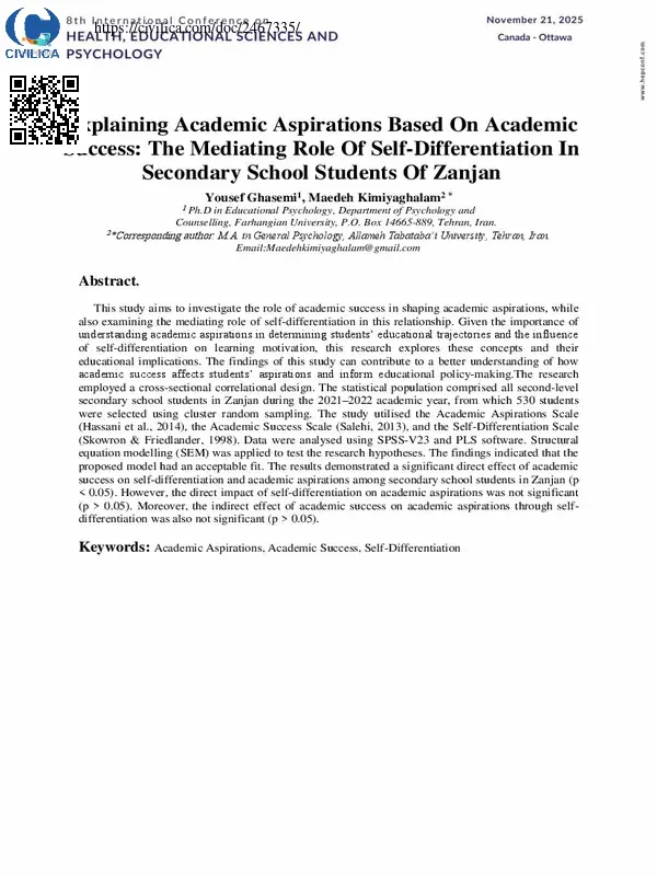 This study aims to investigate the role of academic success in shaping academic aspirations, while also examining the mediating role of self-differentiation in this relationship. Given the importance of understanding academic aspirations in determining students’ educational trajectories and the influence of self-differentiation on learning motivation, this research explores these concepts and their educational implications. The findings of this study can contribute to a better understanding of how academic success affects students’ aspirations and inform educational policy-making.The research employed a cross-sectional correlational design. The statistical population comprised all second-level secondary school students in Zanjan during the ۲۰۲۱–۲۰۲۲ academic year, from which ۵۳۰ students were selected using cluster random sampling. The study utilised the Academic Aspirations Scale (Hassani et al., ۲۰۱۴), the Academic Success Scale (Salehi, ۲۰۱۳), and the Self-Differentiation Scale (Skowron & Friedlander, ۱۹۹۸). Data were analysed using SPSS-V۲۳ and PLS software. Structural equation modelling (SEM) was applied to test the research hypotheses. The findings indicated that the proposed model had an acceptable fit. The results demonstrated a significant direct effect of academic success on self-differentiation and academic aspirations among secondary school students in Zanjan (p < ۰.۰۵). However, the direct impact of self-differentiation on academic aspirations was not significant (p > ۰.۰۵). Moreover, the indirect effect of academic success on academic aspirations through self-differentiation was also not significant (p > ۰.۰۵).