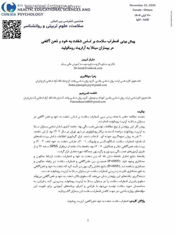 چکیده مقدمه: مطالعه حاضر با هدف پیش بینی اضطراب سلامت بر اساس شفقت به خود و ذهن آگاهی در بیماران مبتلا به آرتریت روماتوئید انجام شد. روش کار: این پژوهش از نوع مطالعات توصیفی همبستگی بود. جامعه آماری شامل تمامی بیماران مبتلا به آرتریت روماتوئید مراجعه کننده به مراکز روماتولوژی در شهر تهران در سال ۱۴۰۳ بود. از این جامعه، ۳۰۰ نفر به روش نمونه گیری خوشه ای انتخاب شدند. ابزار گردآوری اطلاعات شامل پرسشنامه های استاندارد اضطراب سلامت (سالکوسکیس و وارویک، ۲۰۰۱)، مقیاس شفقت به خود (نف، ۲۰۰۳) و پرسشنامه ذهن آگاهی (بائر و همکاران، ۲۰۰۶) بود. داده ها با استفاده از نرم افزار SPSS نسخه ۲۶ و از طریق آزمون های همبستگی پیرسون و رگرسیون چندگانه مورد تحلیل قرار گرفت. یافته ها: نتایج تحلیل داده ها نشان داد که بین شفقت به خود و اضطراب سلامت ارتباط معکوس و معناداری وجود دارد (P<۰/۰۵). همچنین بین ذهن آگاهی و اضطراب سلامت نیز رابطه معکوس و معناداری مشاهده شد (P<۰/۰۵). نتایج تحلیل رگرسیون نیز تایید کرد که شفقت به خود و ذهن آگاهی به طور معناداری قادر به پیش بینی اضطراب سلامت در بیماران مبتلا به آرتریت روماتوئید هستند. نتیجه گیری: یافته های این پژوهش نشان می دهد که سطوح بالاتر شفقت به خود و ذهن آگاهی می تواند سطوح پایین تر اضطراب سلامت را در بیماران مبتلا به آرتریت روماتوئید پیش بینی کند. بنابراین، به متخصصان حوزه سلامت توصیه می شود با طراحی و اجرای برنامه های آموزشی برای تقویت این مولفه های روان شناختی، در جهت کاهش اضطراب سلامت این بیماران گام بردارند.