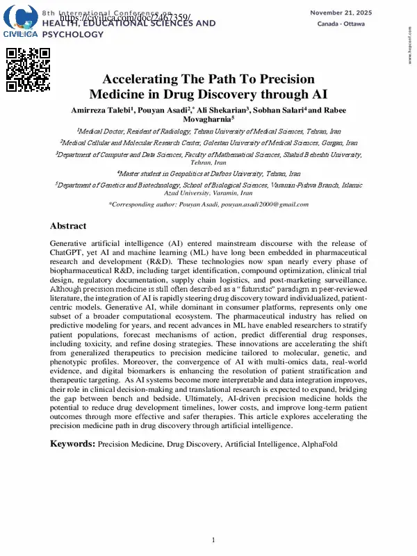 Generative artificial intelligence (AI) entered mainstream discourse with the release of ChatGPT, yet AI and machine learning (ML) have long been embedded in pharmaceutical research and development (R&D). These technologies now span nearly every phase of biopharmaceutical R&D, including target identification, compound optimization, clinical trial design, regulatory documentation, supply chain logistics, and post-marketing surveillance. Although precision medicine is still often described as a “futuristic” paradigm in peer-reviewed literature, the integration of AI is rapidly steering drug discovery toward individualized, patient-centric models. Generative AI, while dominant in consumer platforms, represents only one subset of a broader computational ecosystem. The pharmaceutical industry has relied on predictive modeling for years, and recent advances in ML have enabled researchers to stratify patient populations, forecast mechanisms of action, predict differential drug responses, including toxicity, and refine dosing strategies. These innovations are accelerating the shift from generalized therapeutics to precision medicine tailored to molecular, genetic, and phenotypic profiles. Moreover, the convergence of AI with multi-omics data, real-world evidence, and digital biomarkers is enhancing the resolution of patient stratification and therapeutic targeting. As AI systems become more interpretable and data integration improves, their role in clinical decision-making and translational research is expected to expand, bridging the gap between bench and bedside. Ultimately, AI-driven precision medicine holds the potential to reduce drug development timelines, lower costs, and improve long-term patient outcomes through more effective and safer therapies. This article explores accelerating the precision medicine path in drug discovery through artificial intelligence.