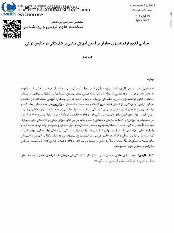 توانمندسازی معلمان ، آموزش مبتنی بر شایستگی ، شایستگی های حرفه ای ، خودکارآمدی معلمان ، توسعه حرفه ای ، مدارس دولتی ، مدل توانمندسازی ، ارزشیابی شایستگی محور