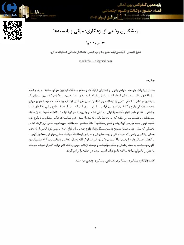 بدنبال پیشرفت و توسعه جوامع بشری و گسترش ارتباطات و سطح مبادلات فیمابین دولتها خاصه افراد و اتخاذ سازوکارهای مناسب به منظور ایجاد امنیت پایدار و مقابله با پدیده ای تحت عنوان بزهکاری که امروزه بعنوان یک پدیده اجتماعی انسانی تلقی و از دیدگاه جرم شناسان امر غیر قابل اجتناب بوده که همواره با ظهور جرایم جدید و پیچیدگی وقوع و کشف آن همچنین فراهم ساختن بستری امن که بتوان از دغدغه وقوع برخی رفتارهای ضد اجتماعی که در طول ادوار مختلف با عنوان بزه تلقی شده و با رویکرد سرکوبگرایانه در گذشته نسبت به آن مقابله نموده نقش و اهمیت بسزایی یافته که امروزه نظریات ارائه شده از سوی جرم شناسان در غالب پیشگیری از وقوع جرم که به نوعی جنبه غیر سرکوبگرایانه و کنشی داشته به لحاظ محاسنی که داشته مورد توجه خاص قرار گرفته لذا در تحقیقی که پیش روست ضمن تشریح و تبیین پیشگیری از وقوع جرم و بیان انواع آن به بررسی نوع خاصی از آن تحت عنوان پیشگیری وضعی که صرفا مبانی و بایسته های آن بوده با رویکرد اتخاذ سیاست جنایی موثر از راه دشوار کردن و یا کاهش احتمالی وقوع آن ضمن بکار بستن روش های غیر سرکوبگرایانه به بیان محاسن و معایب آن و ارائه پیشنهادهای کاربردی مناسب به منظور کاهش و حذف موقعیت ها و فرصت ارتکاب جرم پرداخته تا در فرایند گذر از اندیشه مجرمانه به عمل را با موانع مواجه ساخته تا موجبات امنیت پایدار در جامعه را فراهم گردد.