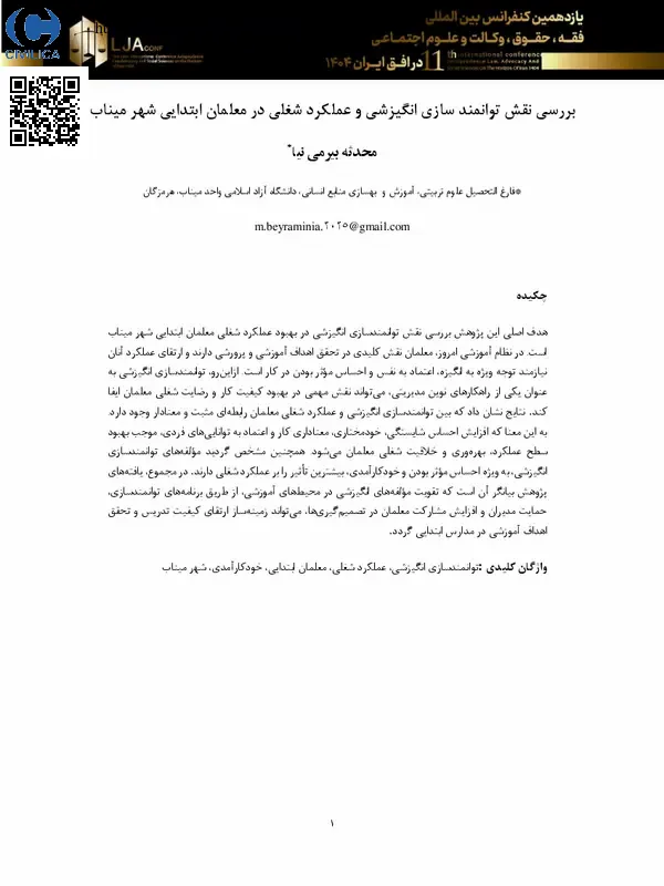 هدف اصلی این پژوهش بررسی نقش توانمندسازی انگیزشی در بهبود عملکرد شغلی معلمان ابتدایی شهر میناب است. در نظام آموزشی امروز معلمان نقش کلیدی در تحقق اهداف آموزشی و پرورشی دارند و ارتقای عملکرد آنان نیازمند توجه ویژه به انگیزه، اعتماد به نفس و احساس موثر بودن در کار است. از این رو توانمندسازی انگیزشی به عنوان یکی از راهکارهای نوین مدیریتی می تواند نقش مهمی در بهبود کیفیت کار و رضایت شغلی معلمان ایفا کند. نتایج نشان داد که بین توانمندسازی انگیزشی و عملکرد شغلی معلمان رابط های مثبت و معنادار وجود دارد. به این معنا که افزایش احساس شایستگی، خودمختاری، معناداری کار و اعتماد به توانایی های فردی موجب بهبود سطح عملکرد، بهره وری و خلاقیت شغلی معلمان می شود. همچنین مشخص گردید مولفه های توانمندسازی انگیزشی به ویژه احساس موثر بودن و خودکارآمدی بیشترین تاثیر را بر عملکرد شغلی دارند. در مجموع، یافته های پژوهش بیانگر آن است که تقویت مولفه های انگیزشی در محیط های آموزشی از طریق برنامه های توانمندسازی، حمایت مدیران و افزایش مشارکت معلمان در تصمیم گیری ها می تواند زمینه ساز ارتقای کیفیت تدریس و تحقق اهداف آموزشی در مدارس ابتدایی گردد.