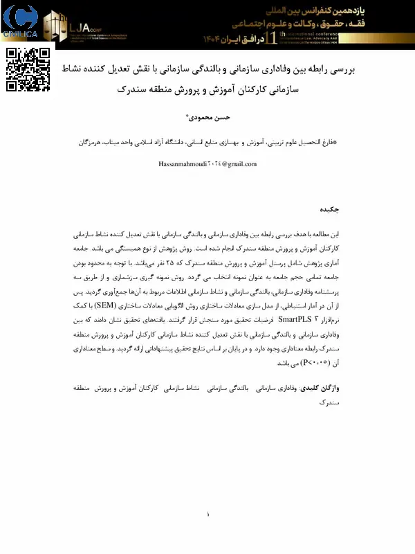 این مطالعه با هدف بررسی رابطه بین وفاداری سازمانی و بالندگی سازمانی با نقش تعدیل کننده نشاط سازمانی کارکنان آموزش و پرورش منطقه سندرک انجام شده است. روش پژوهش از نوع همبستگی می باشد. جامعه آماری پژوهش شامل پرسنل آموزش و پرورش منطقه سندرک که ۲۵ نفر می باشد با توجه به محدود بودن جامعه تمامی حجم جامعه به عنوان نمونه انتخاب می گردد. روش نمونه گیری سرشماری و از طریق سه پرسشنامه وفاداری سازمانی، بالندگی سازمانی و نشاط سازمانی اطلاعات مربوط به آنها جمع آوری گردید. پس از آن در آمار استنباطی از مدل سازی معادلات ساختاری، روش الگویابی معادلات ساختاری (SEM) با کمک نرم افزار SmartPLS فرضیات تحقیق مورد سنجش قرار گرفتند. یافته های تحقیق نشان دادند که بین وفاداری سازمانی و بالندگی سازمانی با نقش تعدیل کننده نشاط سازمانی کارکنان آموزش و پرورش منطقه سندرک رابطه معناداری وجود دارد و در پایان بر اساس نتایج تحقیق پیشنهاداتی ارائه گردید. و سطح معناداری آن (۰,۰۵>P) می باشد.