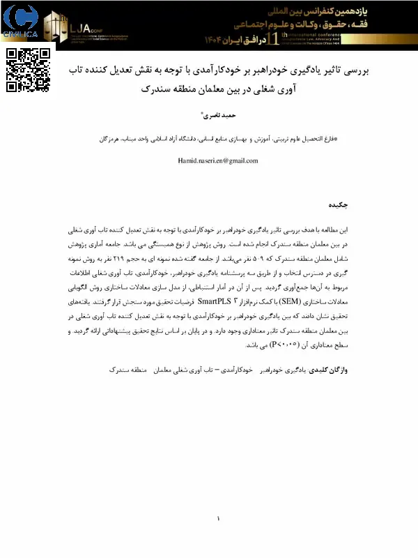 بررسی تاثیر یادگیری خودراهبر بر خودکارآمدی با توجه به نقش تعدیل کننده تاب آوری شغلی در بین معلمان منطقه سندرک