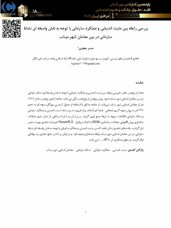 بررسی رابطه بین مثبت اندیشی و عملکرد سازمانی با توجه به نقش واسطه ای نشاط سازمانی در بین معلمان شهر میناب