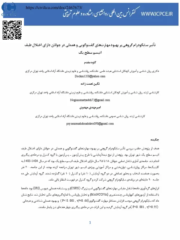 تاثیر سایکودرام گروهی بر بهبود مهارت های گفت وگویی و همدلی در جوانان دارای اختلال طیف اتیسم سطح یک