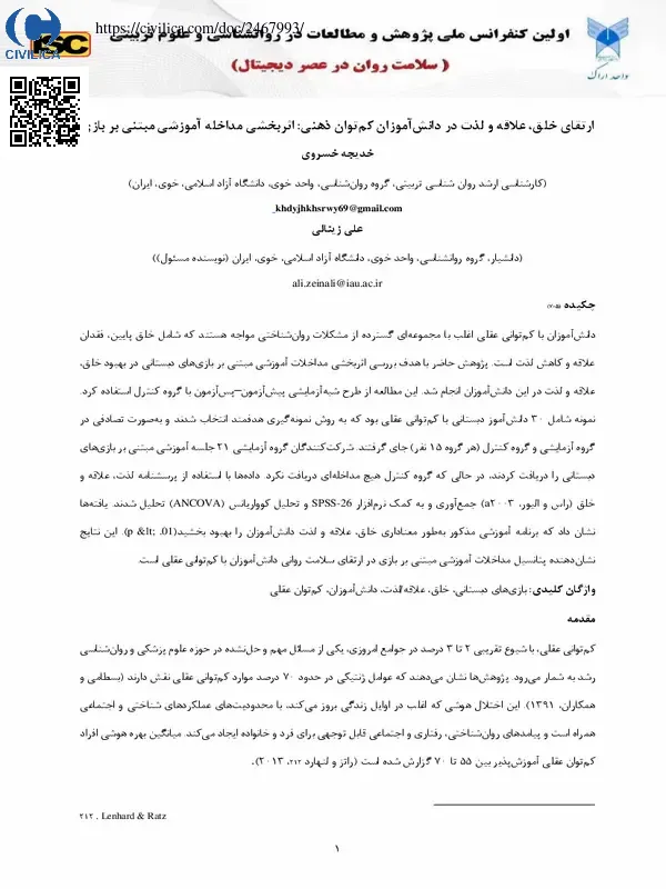 ارتقای خلق، علاقه و لذت در دانش آموزان کم توان ذهنی اثربخشی مداخله آموزشی مبتنی بر بازی