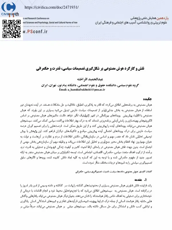 نقش و کارکرد هوش مصنوعی بر شکل گیری تصمیمات ،سیاسی قدرت و حکمرانی