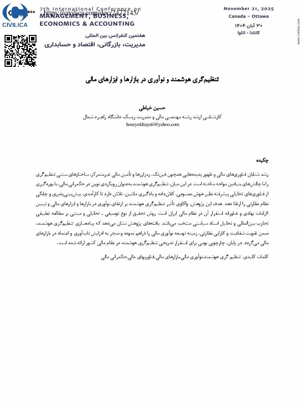 رشد شتابان فناوری های مالی و ظهور پدیده هایی همچون فین تک، رمزارزها و تامین مالی غیرمتمرکز، ساختارهای سنتی تنظیم گری را با چالش های بنیادین مواجه ساخته است. در این میان، تنظیم گری هوشمند به عنوان رویکردی نوین در حکمرانی مالی، با بهره گیری از فناوری های تحلیلی پیشرفته نظیر هوش مصنوعی، کلان داده و یادگیری ماشین، تلاش دارد تا کارآمدی، پیش بینی پذیری و چابکی نظام نظارتی را ارتقا دهد. هدف این پژوهش، واکاوی تاثیر تنظیم گری هوشمند بر ارتقای نوآوری در بازارها و ابزارهای مالی و تبیین الزامات نهادی و فناورانه استقرار آن در نظام مالی ایران است. روش تحقیق از نوع توصیفی تحلیلی و مبتنی بر مطالعه تطبیقی تجارب بین المللی و تحلیل اسناد سیاستی منتخب می باشد. یافته های پژوهش نشان می دهد که پیاده سازی تنظیم گری هوشمند، ضمن تقویت شفافیت و کارایی نظارتی، زمینه توسعه نوآوری مالی را فراهم نموده و منجر به افزایش تاب آوری و اعتماد در بازارهای مالی می گردد. در پایان، چارچوبی بومی برای استقرار تدریجی تنظیم گری هوشمند در نظام مالی کشور ارائه شده است.