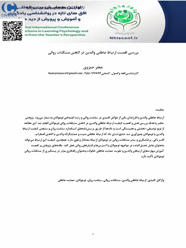 ارتباط عاطفی والدین با فرزندان یکی از عوامل کلیدی در سلامت روانی و رشد اجتماعی نوجوانان به شمار می رود. پژوهش حاضر با هدف بررسی نقش و اهمیت کیفیت ارتباط عاطفی والدین در کاهش مشکلات روانی نوجوانان انجام شد. این مطالعه از نوع توصیفی–تحلیلی و همبستگی است و داده ها از طریق پرسش نامه های استاندارد سلامت روان و سنجش کیفیت ارتباط والدین با نوجوانان جمع آوری شد. نتایج نشان داد که ارتباط عاطفی مثبت و حمایتگرانه والدین با کاهش اضطراب، افسردگی، پرخاشگری و سایر مشکلات روانی در نوجوانان ارتباط معنادار و قوی دارد. همچنین، کیفیت این ارتباط می تواند به عنوان عامل تعدیل کننده در مواجهه نوجوانان با استرس ها و فشارهای روانی عمل کند. یافته های پژوهش بر اهمیت آموزش مهارت های ارتباطی والدین و تقویت حمایت عاطفی خانواده به عنوان راهکاری موثر در پیشگیری از مشکلات روانی نوجوانان تاکید دارد.