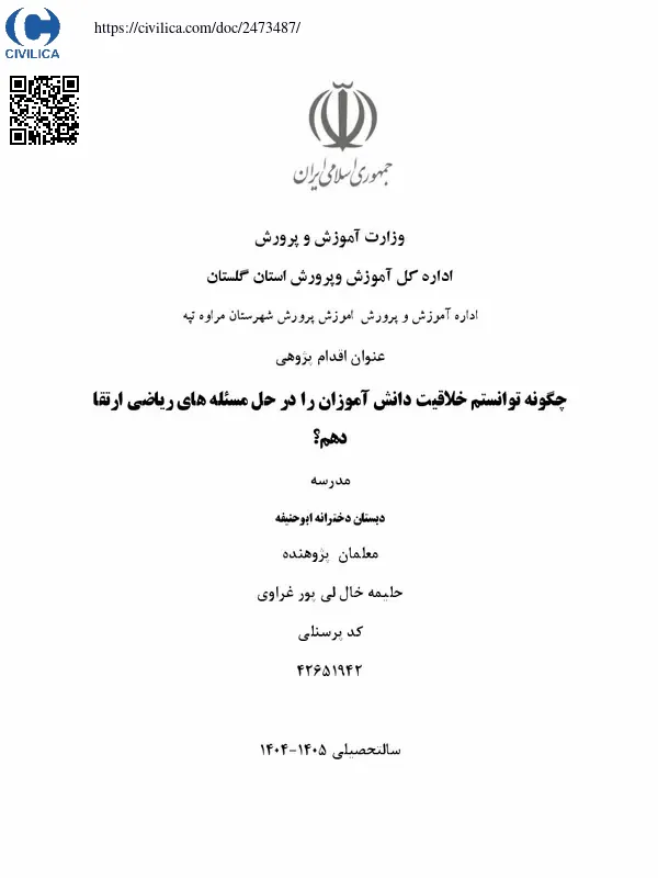 چکیده اقدام پژوهی حاضر با هدف ارتقای خلاقیت دانش آموزان در حل مسئله های ریاضی در پایه پنجم ابتدایی دبستان دخترانه ابوحنیفه شهرستان مراوه تپه انجام شد. در فرایند تدریس درس ریاضی، مشاهده گردید که بسیاری از دانش آموزان در مواجهه با مسائل، به روش های کلیشه ای وابسته بوده و توانایی ارائه راه حل های متنوع و خلاقانه را نداشتند. بر این اساس، مسئله اصلی پژوهش «چگونه می توان خلاقیت دانش آموزان را در حل مسئله های ریاضی افزایش داد» انتخاب گردید. پژوهش به روش اقدام پژوهی و با مشارکت فعال ۳۱ دانش آموز انجام شد. ابتدا از طریق مشاهده، مصاحبه، آزمون های تشخیصی و بررسی تکالیف، علل ضعف خلاقیت شناسایی شد. سپس راهکارهایی همچون استفاده از روش حل مسئله، تدریس فعال، بازی های آموزشی، کار گروهی، طرح سوال های باز، تشویق به ارائه راه حل های متنوع و استفاده از وسایل کمک آموزشی اجرا گردید. نتایج حاصل از اجرای راهکارها نشان داد که علاقه مندی دانش آموزان به درس ریاضی افزایش یافته و توانایی آنان در تحلیل مسائل، ارائه راه حل های نو و مشارکت فعال در کلاس بهبود چشمگیری پیدا کرده است. در پایان می توان نتیجه گرفت که به کارگیری روش های نوین و خلاقانه تدریس، نقش موثری در پرورش خلاقیت دانش آموزان در حل مسئله های ریاضی دارد.