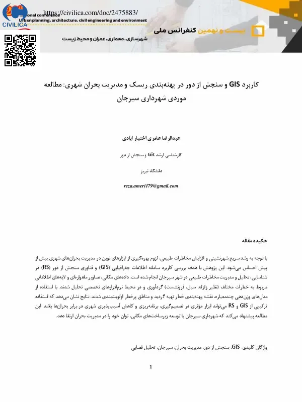 کاربرد GIS و سنجش از دور در پهنه بندی ریسک و مدیریت بحران شهری: مطالعه موردی شهرداری سیرجان