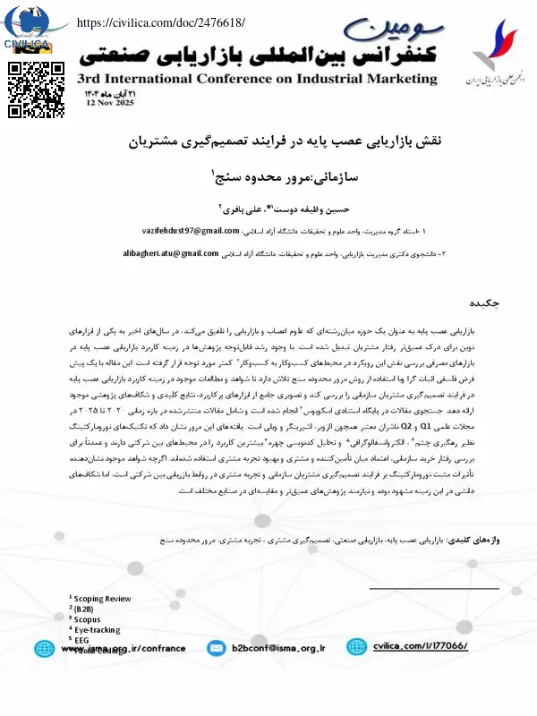 بازاریابی عصب پایه به عنوان یک حوزه میان رشته ای که علوم اعصاب و بازاریابی را تلفیق می کند، در سال های اخیر به یکی از ابزارهای نوین برای درک عمیق تر رفتار مشتریان تبدیل شده است. با وجود رشد قابل توجه پژوهش ها در زمینه کاربرد بازاریابی عصب پایه در بازارهای مصرفی بررسی نقش این رویکرد در محیط های کسب وکار به کسب وکار کمتر مورد توجه قرار گرفته است. این مقاله با یک پیش فرض فلسفی اثبات گرا و با استفاده از روش مرور محدوده سنج تلاش دارد تا شواهد و مطالعات موجود در زمینه کاربرد بازاریابی عصب پایه در فرایند تصمیم گیری مشتریان سازمانی را بررسی کند و تصویری جامع از ابزارهای پرکاربرد، نتایج کلیدی و شکاف های پژوهشی موجود ارائه دهد. جستجوی مقالات در پایگاه استنادی اسکوپوس انجام شده است و شامل مقالات منتشرشده در بازه زمانی ۲۰۲۰ تا ۲۰۲۵ در مجلات علمی Q۱ و Q۲ ناشران معتبر همچون الزویر، اشپرینگر و ویلی است. یافته های این مرور نشان داد که تکنیک های نورومارکتینگ نظیر رهگیری چشم، الکتروانسفالوگرافی و تحلیل کدنویسی چهره بیشترین کاربرد را در محیط های بین شرکتی دارند و عمدتا برای بررسی رفتار خرید سازمانی، اعتماد میان تامین کننده و مشتری و بهبود تجربه مشتری استفاده شده اند. اگرچه شواهد موجود نشان دهنده تاثیرات مثبت نورومارکتینگ بر فرایند تصمیم گیری مشتریان سازمانی و تجربه مشتری در روابط بازاریابی بین شرکتی است، اما شکاف های دانشی در این زمینه مشهود بوده و نیازمند پژوهش های عمیق تر و مقایسه ای در صنایع مختلف است.