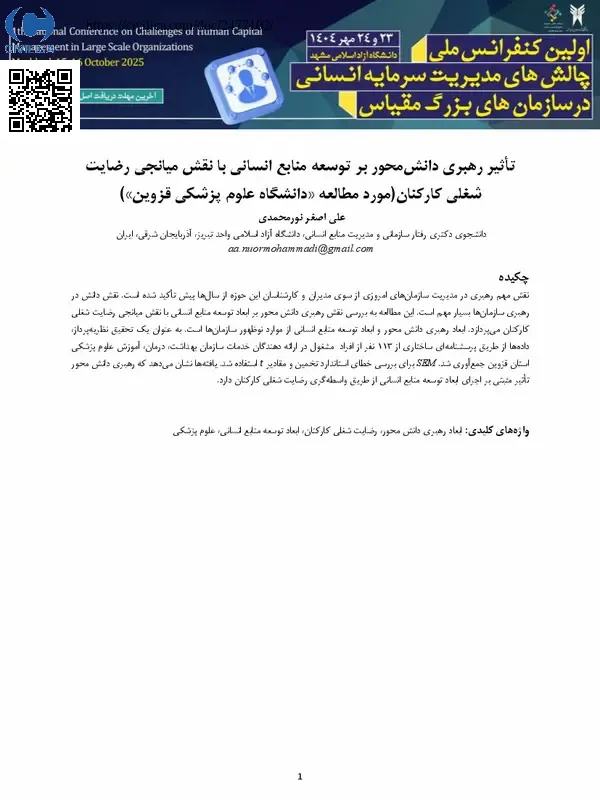 تاثیر رهبری دانش محور بر توسعه منابع انسانی با نقش میانجی رضایت شغلی کارکنان(مورد مطالعه «دانشگاه علوم پزشکی قزوین»)