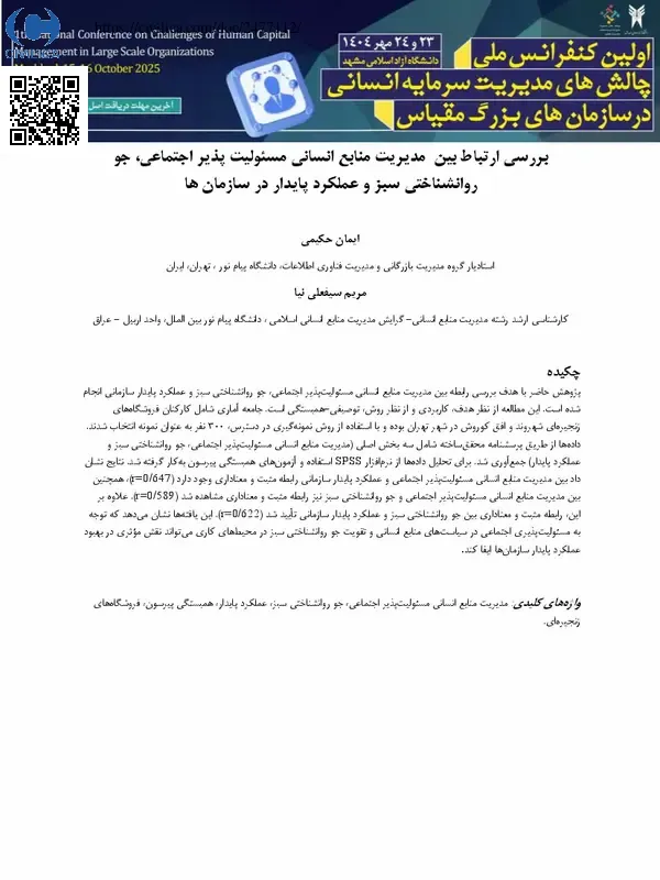 پژوهش حاضر با هدف بررسی رابطه بین مدیریت منابع انسانی مسئولیت پذیر اجتماعی، جو روانشناختی سبز و عملکرد پایدار سازمانی انجام شده است. این مطالعه از نظر هدف، کاربردی و از نظر روش، توصیفی-همبستگی است. جامعه آماری شامل کارکنان فروشگاه های زنجیره ای شهروند و افق کوروش در شهر تهران بوده و با استفاده از روش نمونه گیری در دسترس، ۳۰۰ نفر به عنوان نمونه انتخاب شدند. داده ها از طریق پرسشنامه محقق ساخته شامل سه بخش اصلی (مدیریت منابع انسانی مسئولیت پذیر اجتماعی، جو روانشناختی سبز و عملکرد پایدار) جمع آوری شد. برای تحلیل داده ها از نرم افزار SPSS استفاده و آزمون های همبستگی پیرسون به کار گرفته شد. نتایج نشان داد بین مدیریت منابع انسانی مسئولیت پذیر اجتماعی و عملکرد پایدار سازمانی رابطه مثبت و معناداری وجود دارد (r=۰/۶۴۷)، همچنین بین مدیریت منابع انسانی مسئولیت پذیر اجتماعی و جو روانشناختی سبز نیز رابطه مثبت و معناداری مشاهده شد (r=۰/۵۸۹). علاوه بر این، رابطه مثبت و معناداری بین جو روانشناختی سبز و عملکرد پایدار سازمانی تایید شد (r=۰/۶۲۲). این یافته ها نشان می دهد که توجه به مسئولیت پذیری اجتماعی در سیاست های منابع انسانی و تقویت جو روانشناختی سبز در محیط های کاری می تواند نقش موثری در بهبود عملکرد پایدار سازمان ها ایفا کند.