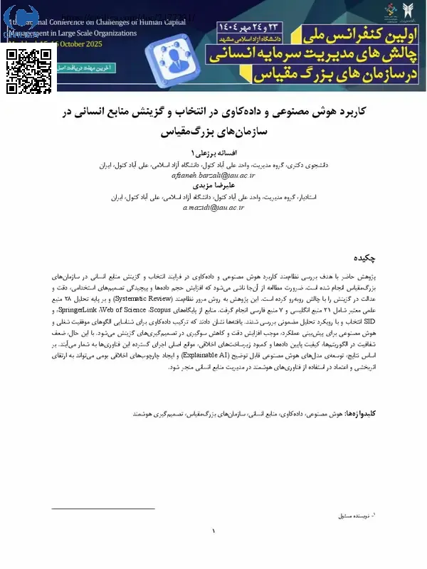 پژوهش حاضر با هدف بررسی نظام مند کاربرد هوش مصنوعی و داده کاوی در فرایند انتخاب و گزینش منابع انسانی در سازمان های بزرگ مقیاس انجام شده است. ضرورت مطالعه از آن جا ناشی می شود که افزایش حجم داده ها و پیچیدگی تصمیم های استخدامی، دقت و عدالت در گزینش را با چالش روبه رو کرده است. این پژوهش به روش مرور نظام مند (Systematic Review) و بر پایه تحلیل ۲۸ منبع علمی معتبر شامل ۲۱ منبع انگلیسی و ۷ منبع فارسی انجام گرفت. منابع از پایگاه های Scopus، Web of Science، SpringerLink، و SID انتخاب و با رویکرد تحلیل مضمونی بررسی شدند. یافته ها نشان دادند که ترکیب داده کاوی برای شناسایی الگوهای موفقیت شغلی و هوش مصنوعی برای پیش بینی عملکرد، موجب افزایش دقت و کاهش سوگیری در تصمیم گیری های گزینش می شود. با این حال، ضعف شفافیت در الگوریتم ها، کیفیت پایین داده ها و کمبود زیرساخت های اخلاقی، موانع اصلی اجرای گسترده این فناوری ها به شمار می آیند. بر اساس نتایج، توسعه ی مدل های هوش مصنوعی قابل توضیح (Explainable AI) و ایجاد چارچوب های اخلاقی بومی می تواند به ارتقای اثربخشی و اعتماد در استفاده از فناوری های هوشمند در مدیریت منابع انسانی منجر شود.